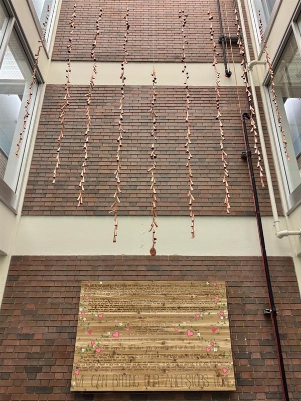 The two women pondered, listened and came together to create sister pieces—the hundreds of jingles that make up Sings the Medicines, and the hand-decorated cedar plaque We Can Bring Our Ancestors Home complement one another, transforming the atrium space into a learning opportunity and create a healing space on the Fort Garry campus.