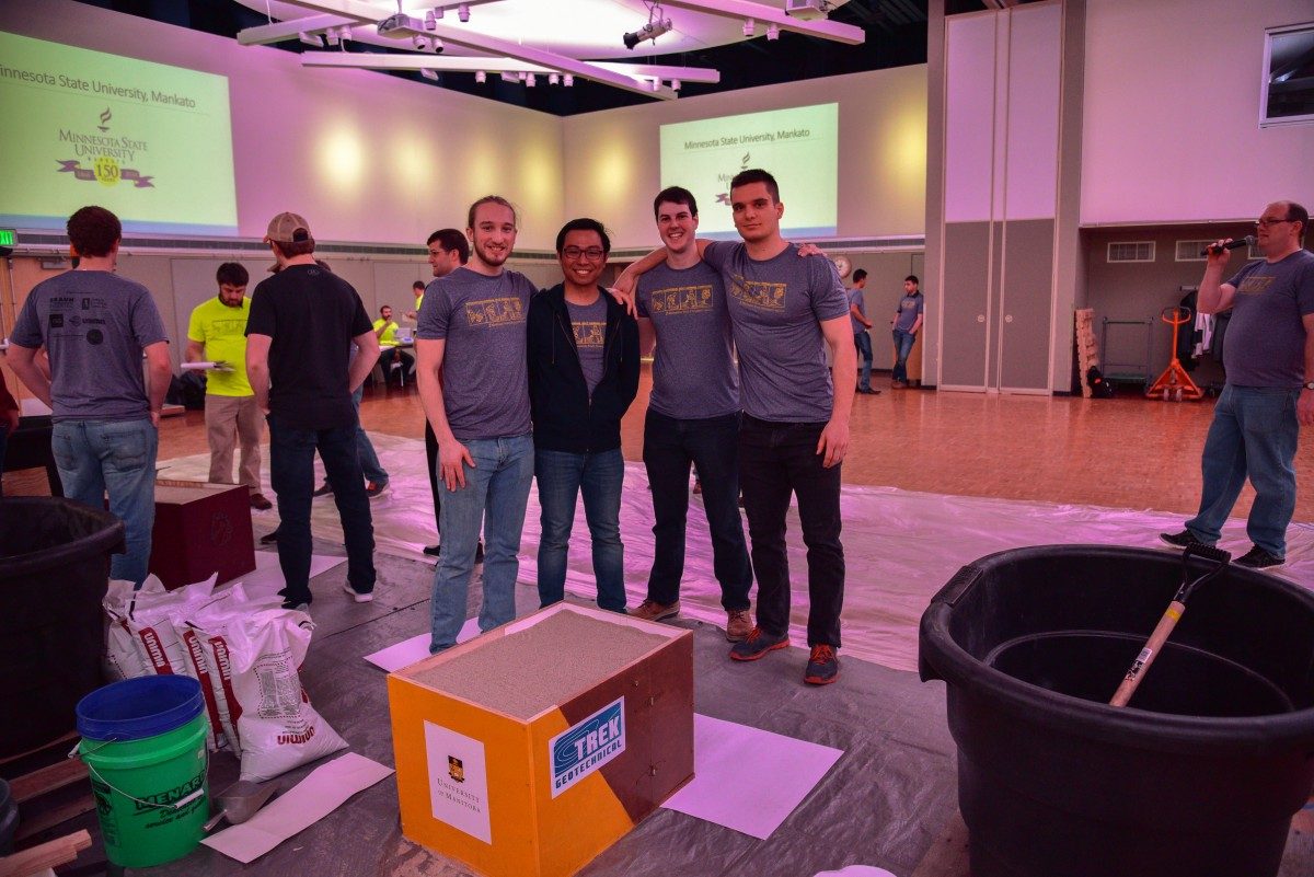 On March 24, 2017, students from the Faculty of Engineering traveled down south of the border to participate in the 2017 GeoWall competition hosted by the Minnesota State University, Mankato. The objective of the GeoWall competition was to design and build a model mechanically stabilized earth (MSE) retaining wall using paper reinforcement taped to a posterboard wall facing. The design goal was to use the least amount of reinforcement to support the retained soil and design loads. The team from U of M was the only Canadian Team to participate out of the seven universities participating in the event and placed 3rd in the competition and placed 2nd on their report. This was the first time a U of M team has competed.
