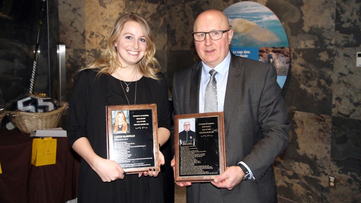 2018 Bison Hockey Hall of Fame Inductees: Caitlin McDonald (left), Bob Lowes (right).