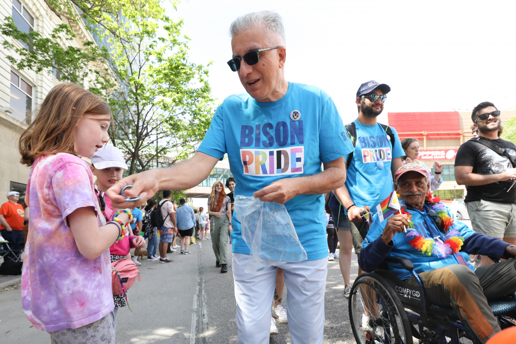 - UM President and Vice-Chancellor engages with spectators during the 2024 Pride Winnipeg Parade // Photo by Mike Latchislaw