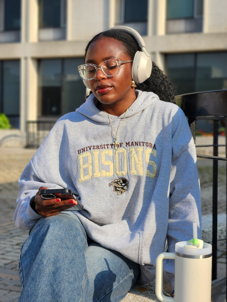 - Arts student Temi Oyewole repping Bison gear and just hanging out on her phone like students do // Photo by Amber Ostermann