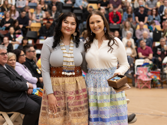 Hope Ace (right), recipient of the 2025 Migizii Award, stands with nominator Sheri Shorting (left) at the 36th Annual Traditional Graduation Pow Wow. Photo by Adam Dolman
