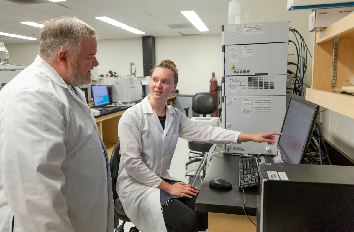 Dr. James House and a research student work on novel food processing and quality assurance techniques at a UM Faculty of Agricultural and Food Sciences lab.