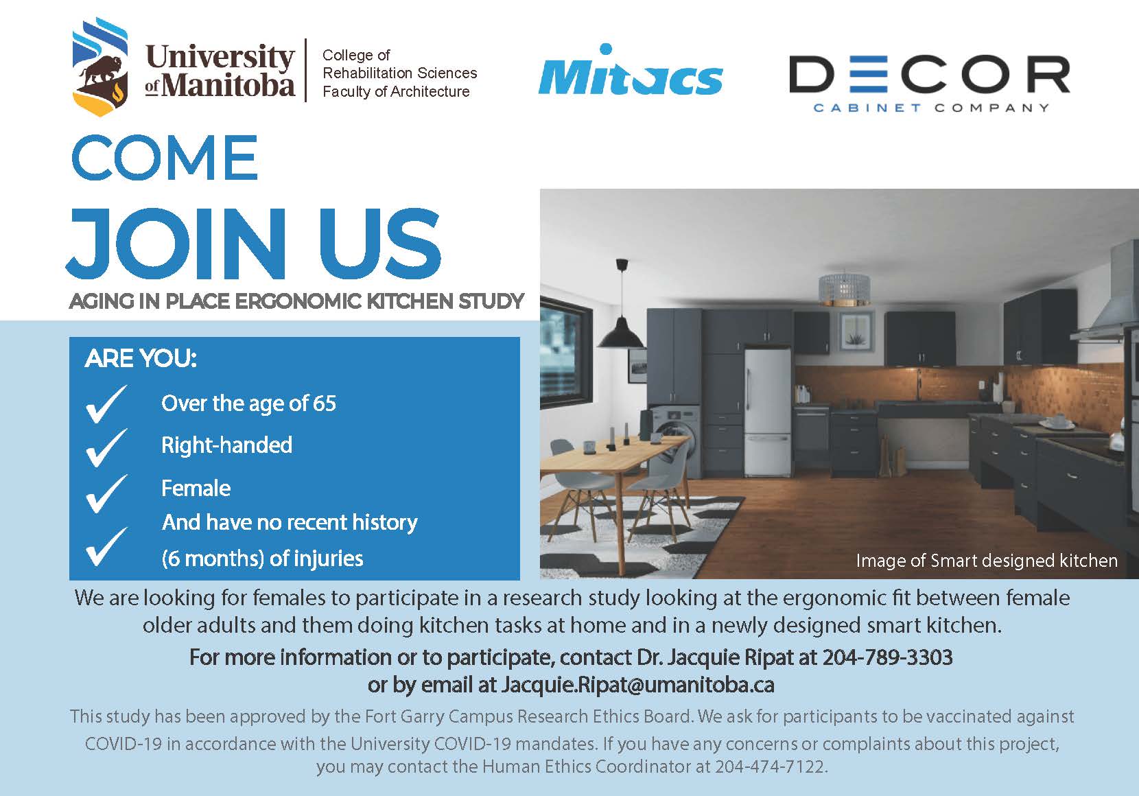 We are still recruiting older female participants for our project! For more information to participate, please contact Dr. Jacquie Ripat by phone at 204-789-3303 or by email at Jacquie.Ripat@umanitoba.ca.