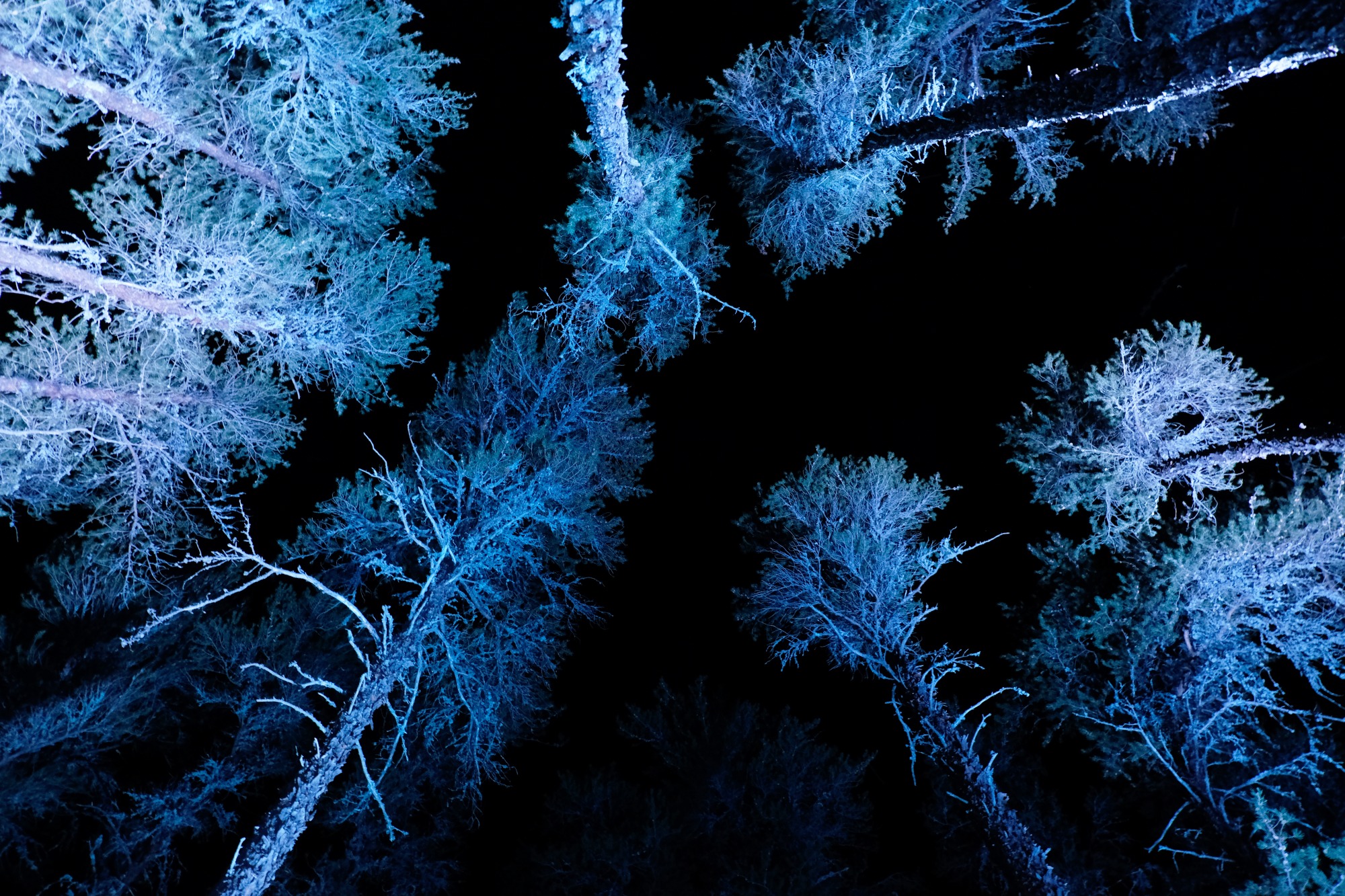 The installation uses accelerometer and ultrasonic-range-finding sensors to map the movement of swaying trees and human/non-human visitors in the forest.