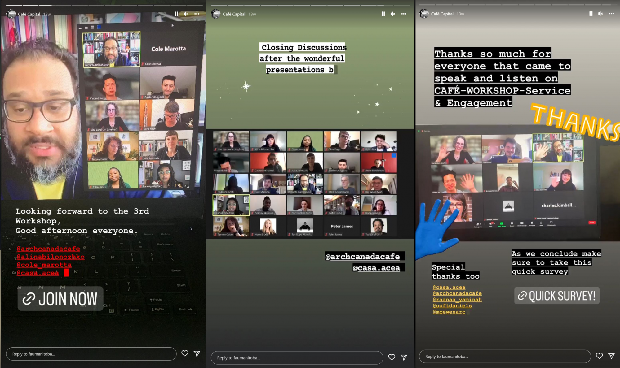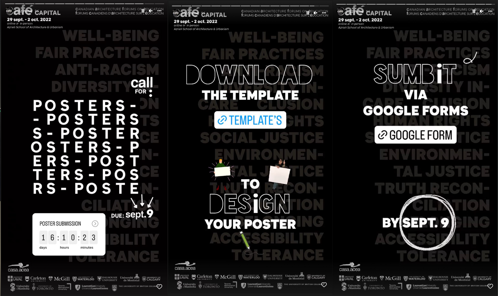CAFÉ Capital is a continuation of the Canadian Architecture Forums on Education (CAFÉ), which began in 2019. CAFÉ Capital consists of a collection of events discussing equity in architecture and includes three online workshops (in May 2022), one in-person conference (Sept. 29 to Oct. 2, 2022) and a poster gallery. My work with Lisa spanned these events by generating videos and graphics to inform the public about each workshop, and recording and summarizing the presentations and conversations held in these workshops.
