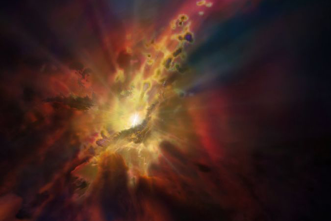 Artist’s concept showing condensing clouds of cold molecular gas around Abell 2597. // Credit: NRAO/AUI/NSF; Dana Berry/SkyWorks; ALMA (ESO/NAOJ/NRAO)