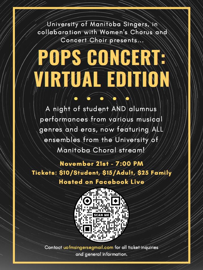 - Tickets: $10 for students/$15 for adults/$25 for families (To purchase tickets, fill out the form at https://forms.gle/2nhVpta9cxmBd4ML9, and then submit payment via e-transfer to uofmsingers@gmail.com. If e-transfer is not available to you, please check “PayPal,” and the University Singers will send you an invoice for your tickets. You do not need a PayPal account to process your tickets via this method. A private Facebook Live link will then be sent to you to enjoy the concert!)