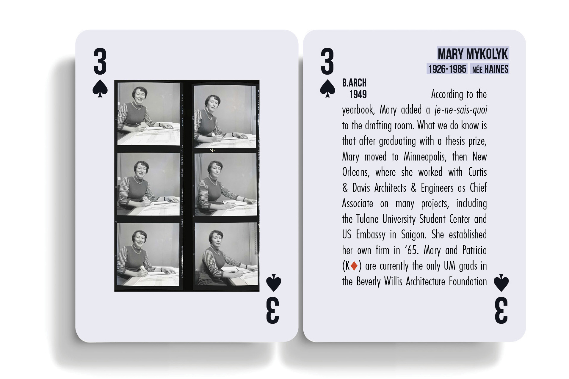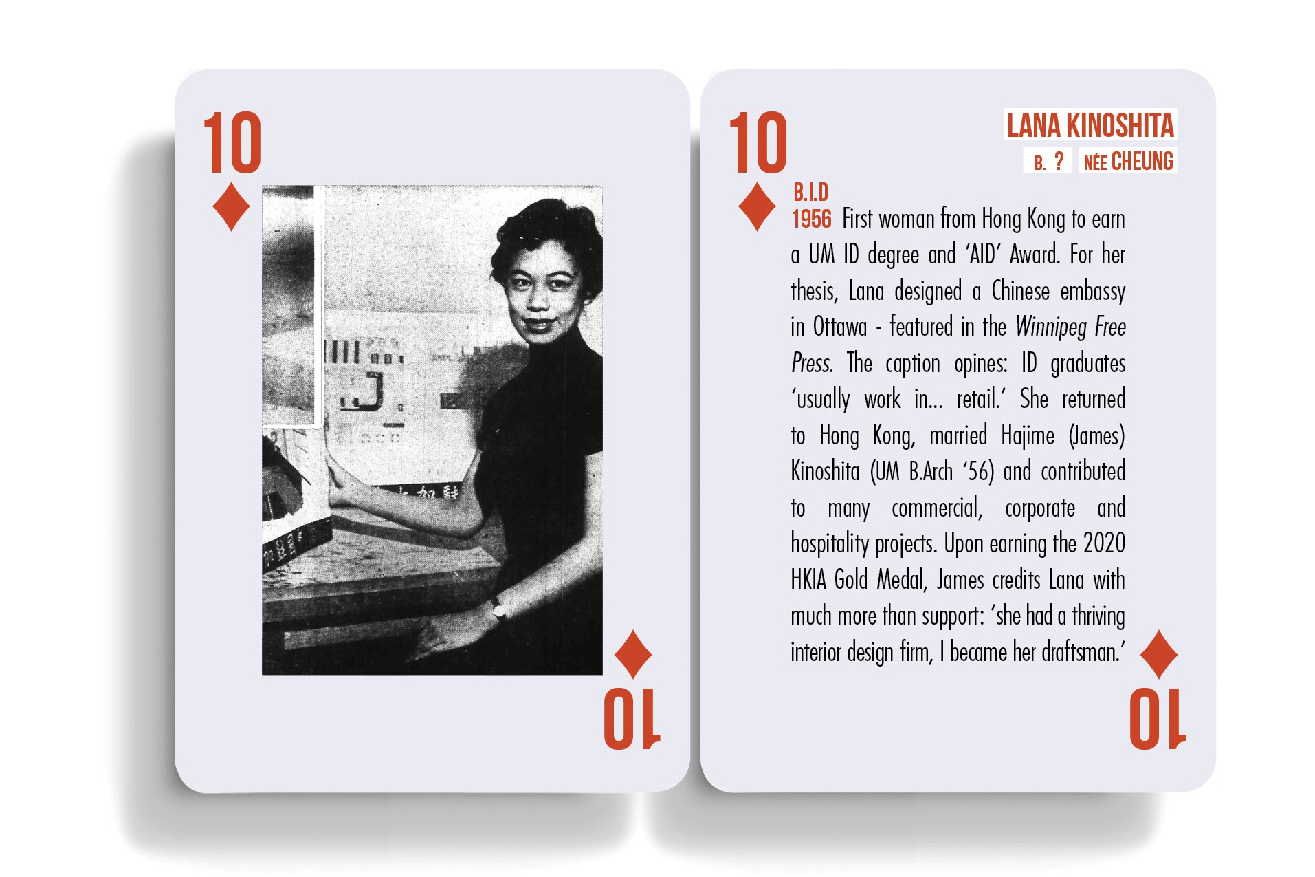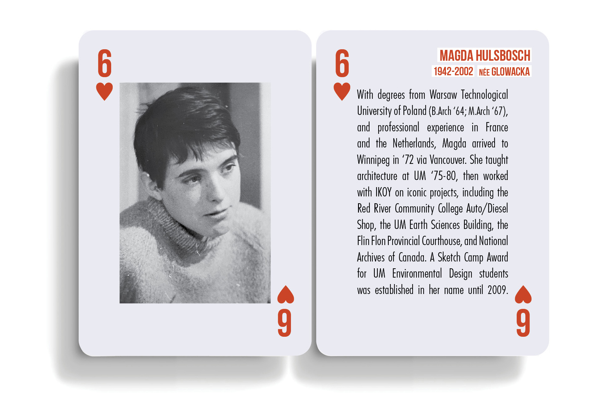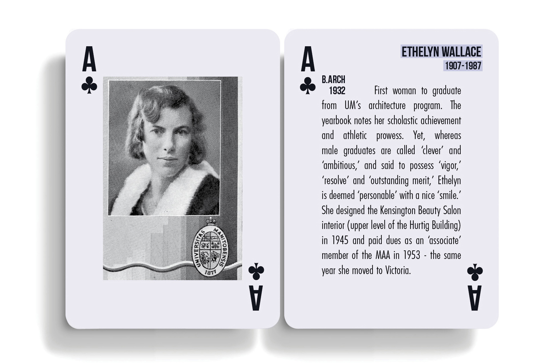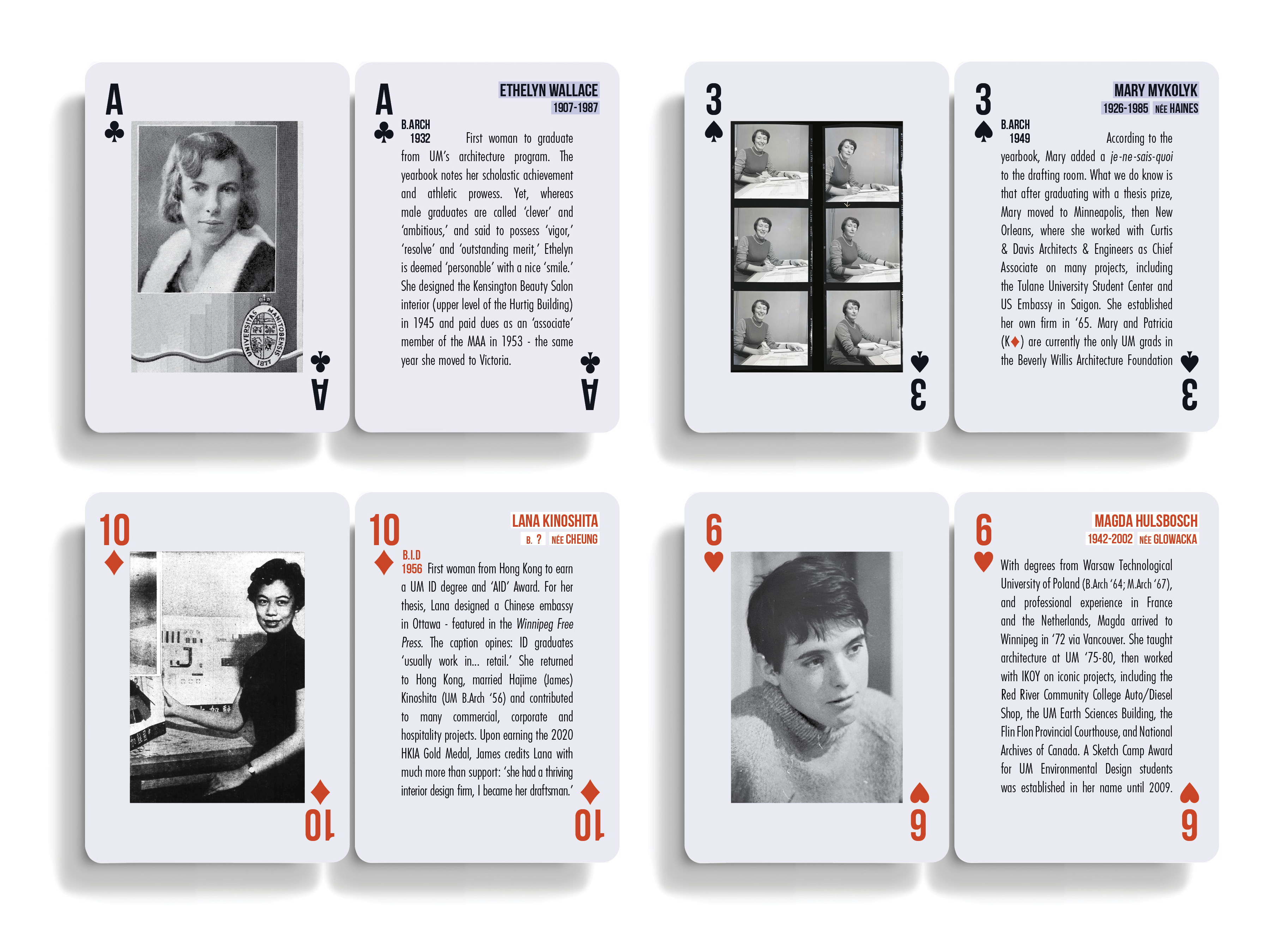 The playing cards are organized by suit: Clubs and Spades feature the first women graduates from the University of Manitoba’s B.Arch, M.Arch and Community Planning programs. Diamonds highlight women in Interior Decoration and Interior Design, from the program’s founding Chair to its most celebrated alumna. Hearts honour women who studied elsewhere but intersected Manitoba in significant ways, plus a trio of women whose early UM studies launched accomplished and still active careers in architecture, landscape and urbanism.