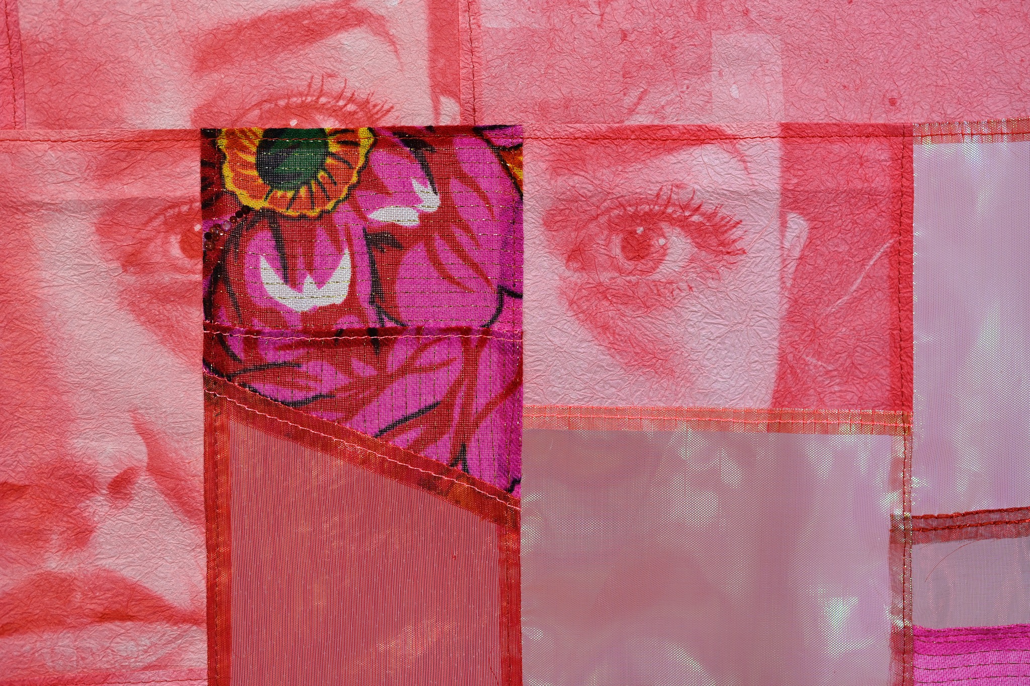 Vibrant, luminous, and intricately detailed, Dion’s quilts and composite portraits merge synthetic fabrics, floral scarves, and translucent papers into layered reflections on care, strength, and connection. His recent works incorporate rose motifs—symbols shared across Indigenous, Ukrainian, and Palestinian communities—as gestures of empathy and unity.