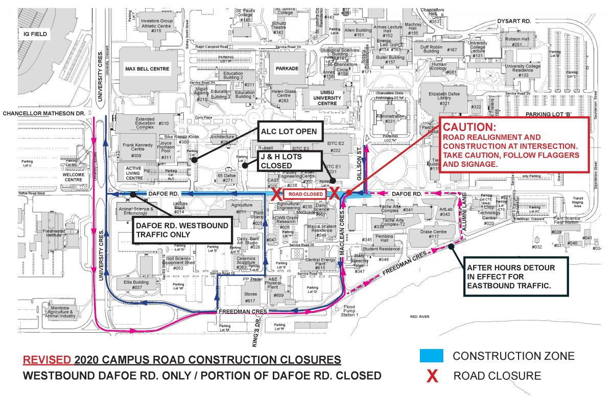 - No eastbound traffic between 5pm and 7am on Dafoe Road between Gillson Street and MacLean Crescent. Access to N Lot via Alumni Lane only.