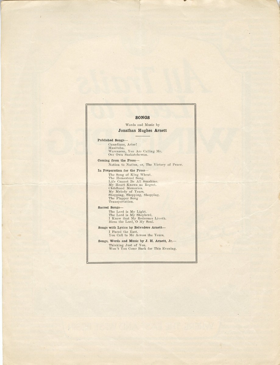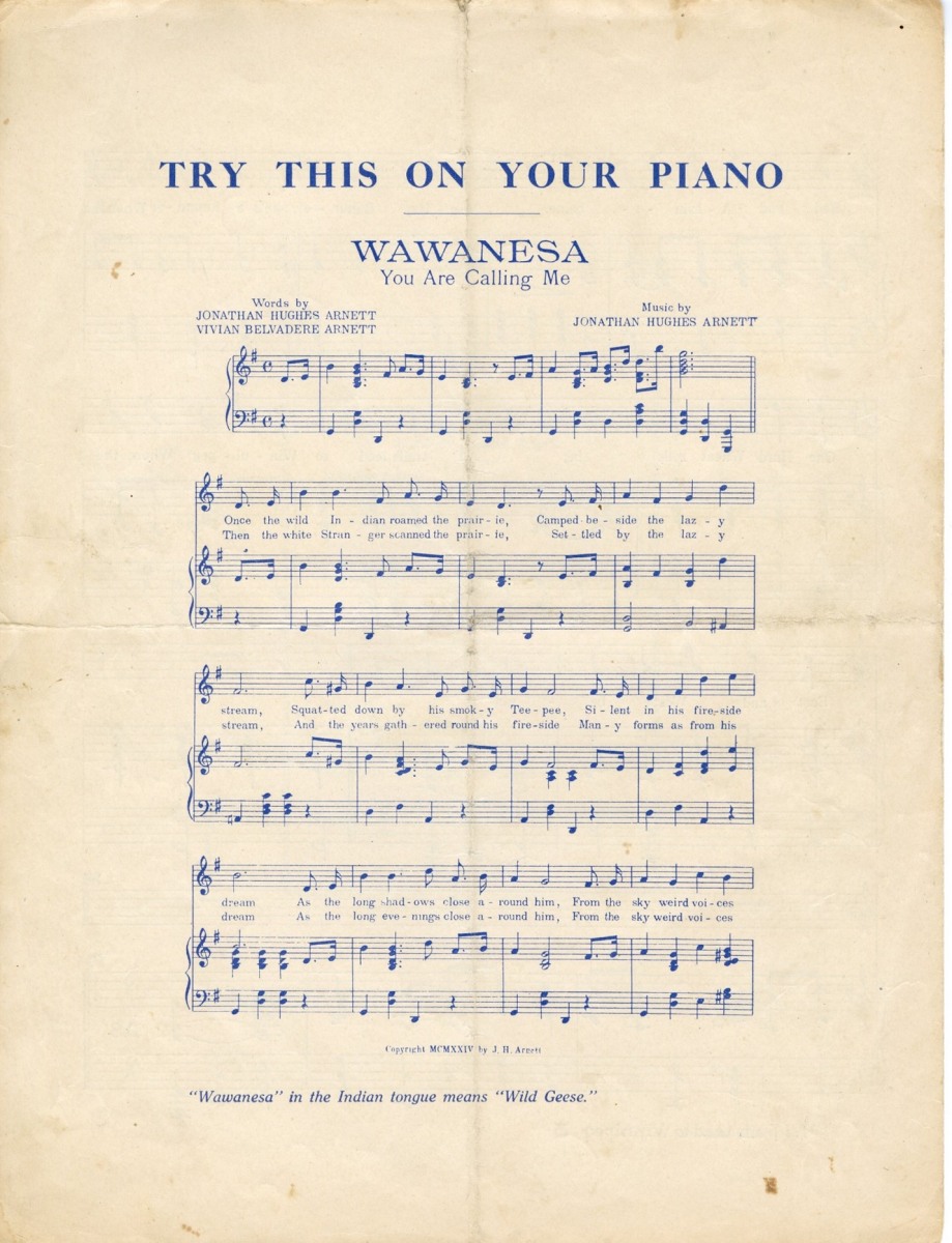 The University of Manitoba Archives & Special Collections acquired a copy of the sheet music for this song in 2019. The cover of the six-page folio shows a photo of Winnipeg’s skyline and an illustration of cars, trucks and trains all converging on a golden gateway. At the top are two sheaves of wheat flanking the original City of Winnipeg crest. On the verso side of the cover page is a list of songs composed by Arnett. The musical score has a Canadian and American copyright of 1925. On the back cover of the folio is the song, “Wawanesa, You Are Calling Me”.