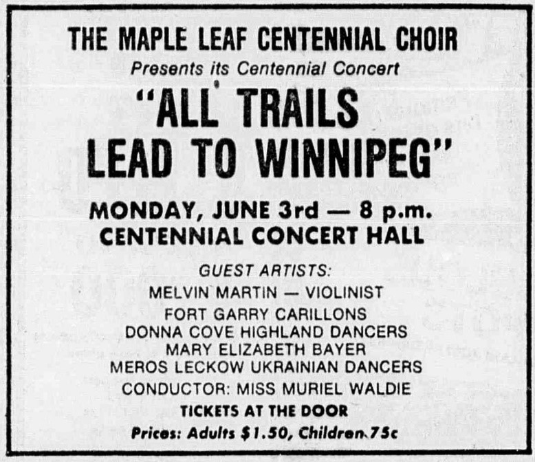 “All Trails Lead to Winnipeg” was performed publicly for the first time by the Rotary Club Minstrels at the Walker Theatre on March 25, 1925. In subsequent decades, the song was performed at milestone civic anniversaries, including Winnipeg’s 75th anniversary in 1949 and its centennial in 1974. (Although Winnipeg’s incorporation was on November 8, 1873, the anniversary is usually dated from the first civic election and first city council meeting in January 1874.)