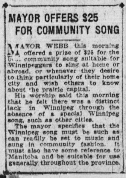 The song was widely promoted and copies of the sheet music could be bought for 35 cents. In the words of Mayor Webb, “It is a wonderful song, and, with the musical accompaniment, is likely to become very popular. In fact, I am most hopeful that the citizens will take it up and make it a real Winnipeg song. It is my intention to have it sung at all theatres and at all gatherings of men and women, and I will try also to have the schools take it up.”