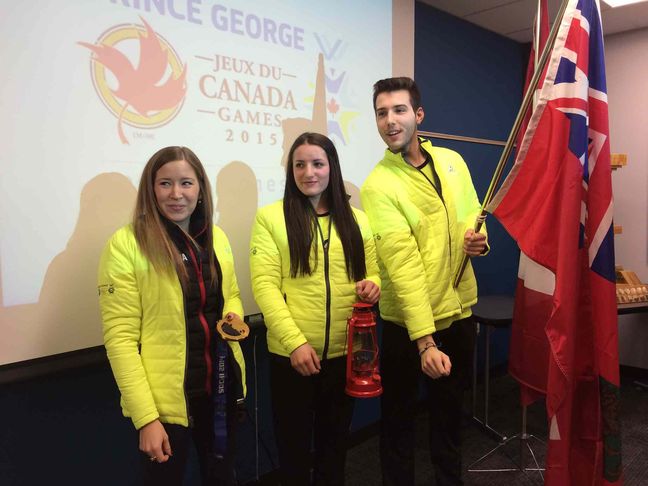 Image courtesy of the Winnipeg Free Press: Archery competitor Keenan Brown, seen at a press conference prior to the Canada Winter Games with hockey player Christian Higham, centre, and honorary Manitoba captain Kaitlyn Lawes, left, earned Manitoba's first medal, a gold, in Prince George, B.C.